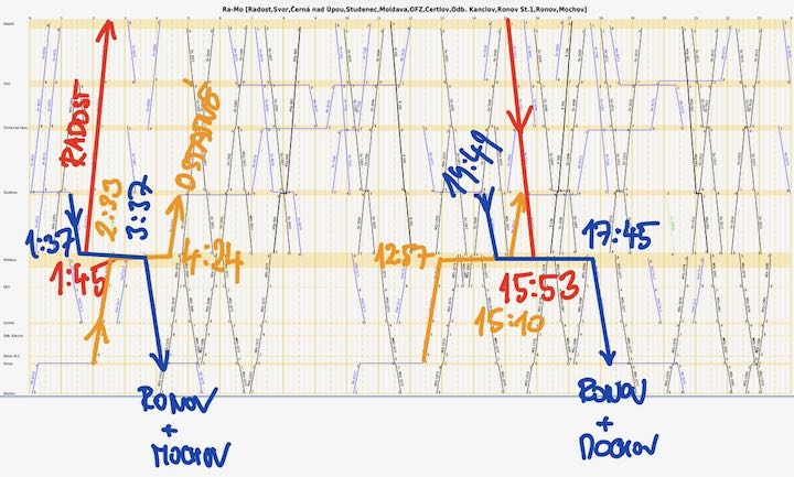 ... ale ako píšem, okak bol pravdou. Majster GVD mi to vymyslel tak, že Pn-ka sa v Radosti (ako skrytá stanica SVET) otočila, ale neodišla do OFZ hneď, ale v stanci Svor prešla na odbočnú trať a tam sa vymenila za iný Pn vlak, ktorý ale nbol len ten predchádzajúci, ale bol preskladaný inými vagónmi čo tak čakali. A takto preskládaný opäť cez Radosť prišiel do OFZ. Takto som mal tri Pn-ky. Ďakujem, krásne.