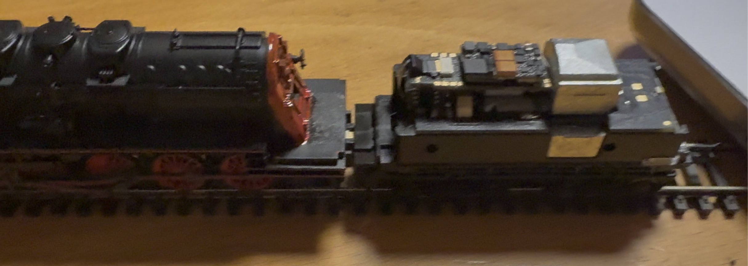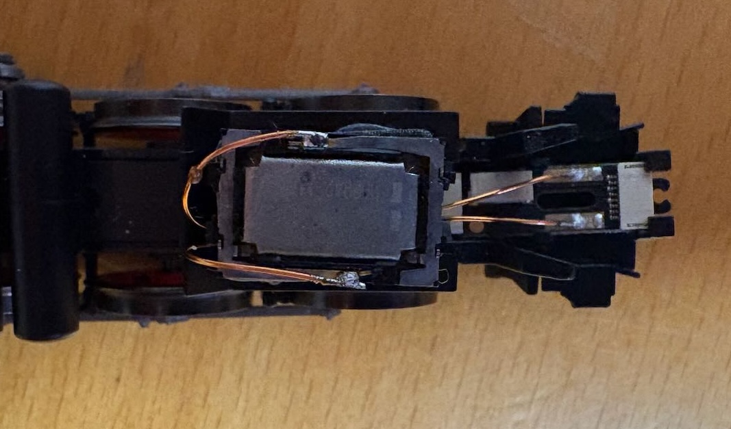 - žádné dráty nikde, použit konektor spřáhla. (To závaží v tendru je další možné místo pro reprobox. Jen by měl tendr nižší hmotnost a tedy i menší tažnou sílu.)